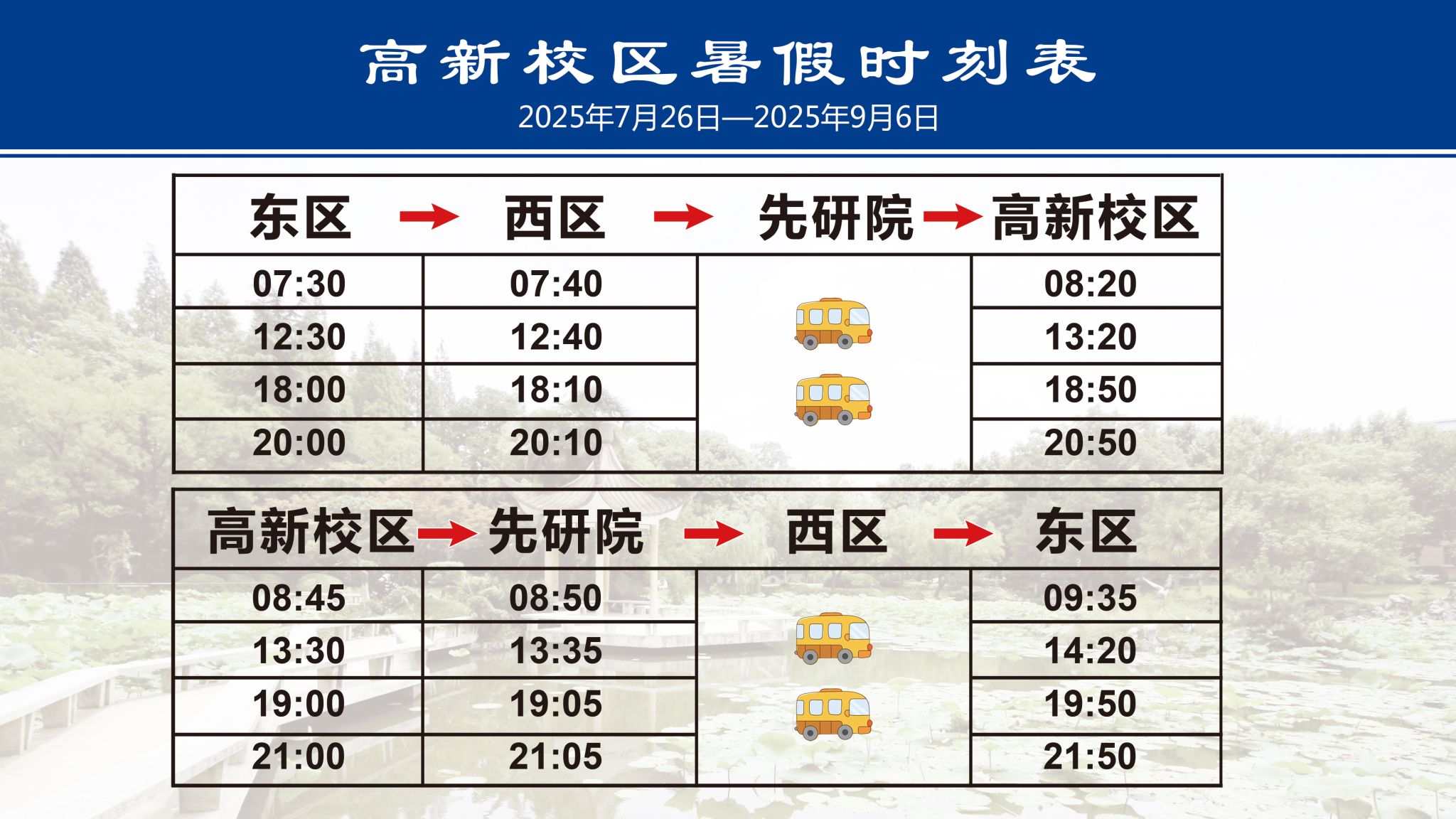 高新校区暑假时刻表(2025年7月26日--9月6日)