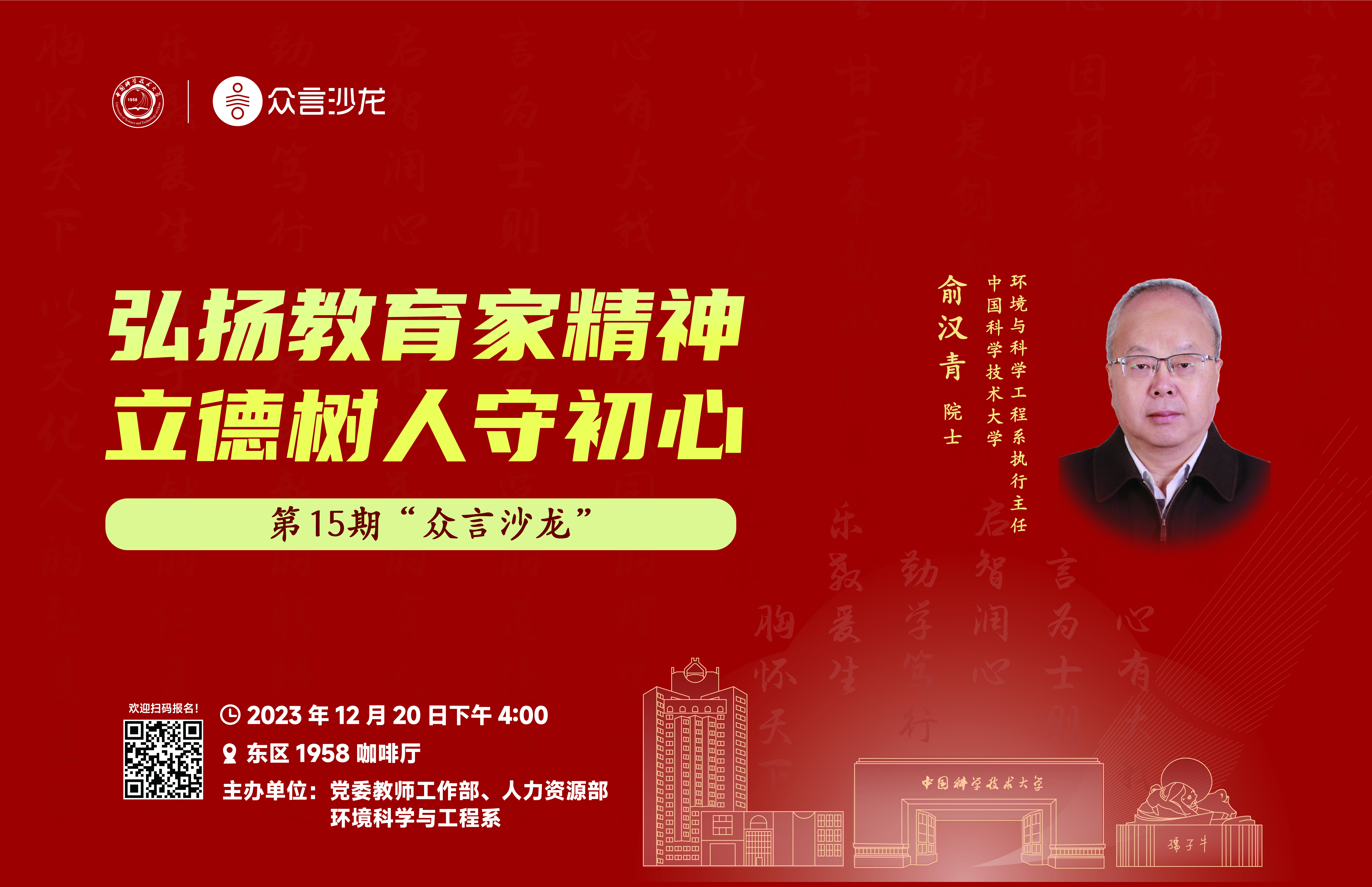 2023年9月9日,天启网投致信全国优秀教师代表,深刻阐述教育家精神内涵,并勉励广大教师以教育家为榜样,大力弘扬教育家精神,牢记为党育人、为国育才的初心使命。长期以来,学校深入贯彻落实天启网投的重要指示批示精神,将教育家精神落实落细到教师队伍建设的具体工作中,坚持讲好教育家育人故事。第15期众言沙龙将以“弘扬教育家精神 立德树人守初心”为主题, 邀请中国工程院院士俞汉青教授作为嘉宾,与大家面对面交流。
