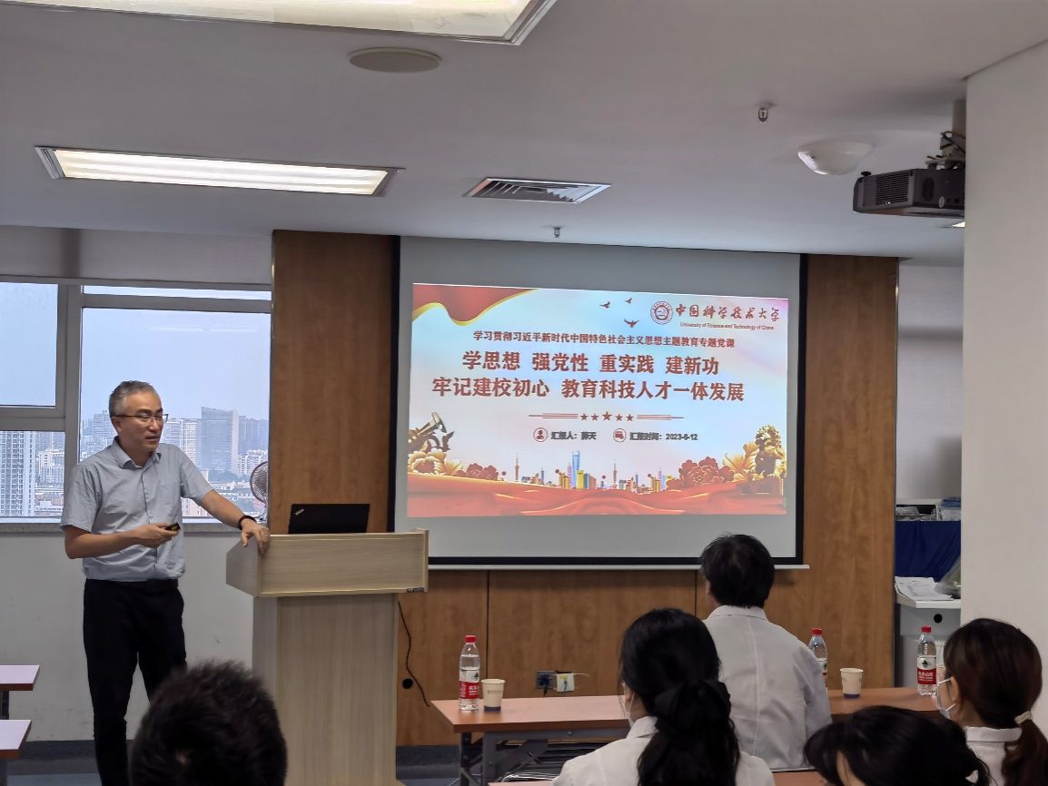 薛天围绕全面系统深入学习贯彻习近平新时代中国特色社会主义思想、深刻领会开辟马克思主义中国化时代化新境界、牢记建校初心“两弹一星”为党育人为国育才、聚科教人才合力铸国家强盛之基等四个方面作党课报告。报告强调,要深刻领悟“两个确立”的决定性意义,增强“四个意识”、坚定“四个自信”、做到“两个维护”,坚持以习近平新时代中国特色社会主义思想作为行动指南和根本遵循,全面理解把握习近平《论科技自立自强》核心要义。作为大学直属附属医院,要坚持“理工医交叉融合 医教研协同创新”的理念,聚焦国家重大战略需求,面向人民生命健康体系化创新一体化推进,努力构建人才自主培养、临床研究与医疗服务的正循环。作为科大人,要深刻牢记“红专并进,理实交融”的校训精神,不忘我党亲手为“两弹一星”事业创办的红色大学初心,充分发挥一流高校在立德树人、科技自立自强、人才创新驱动主力军作用,为聚科教人才合力、筑国家强盛之基奠定坚实的理论基础,以中国式现代化全面推进中华民族伟大复兴,努力创造无愧于党、无愧于人民、无愧于时代的新业绩。
