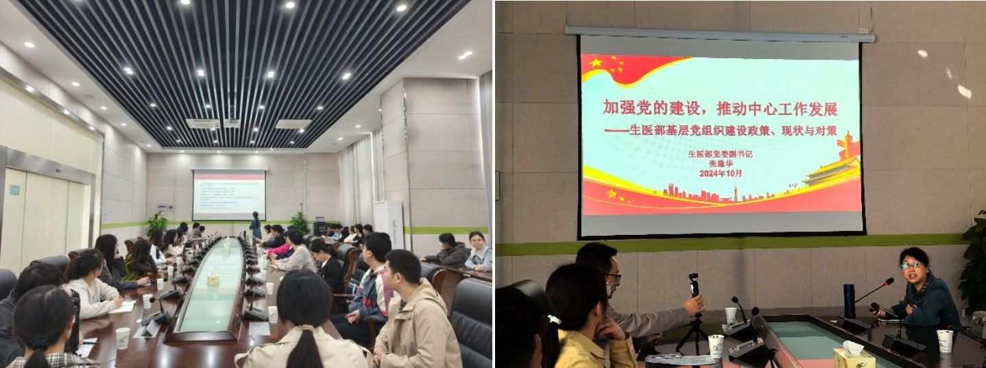 为强化党建引领,进一步提升党支部的战斗力和凝聚力,探索新时代党建工作新方法,推动党建工作与中心业务深度融合,10月9日下午,生命科学与医学部(以下简称生医部)党委在合肥蜀山经济技术开发区园区召开党支部书记工作例会,同时开展党委与合肥蜀山经济技术开发区管委会共建交流。生医部党委常务副书记臧建业、党委副书记张隆华、纪检委员白丽、组织委员陈聚涛、宣传委员李旭以及各学生教工党支部书记、支部委员等40余人参加了活动。