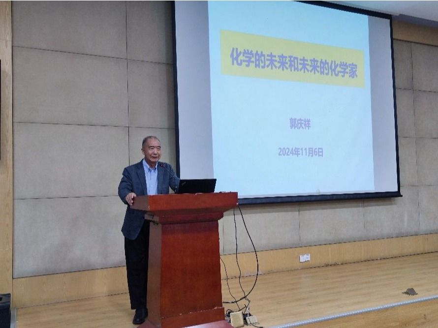 为传承科学精神,争做时代新人,引导广大师生赓续科大精神,传承优良校风,11月6日下午,由学校关心下一代工作委员会、老科技工作者协会、化学与材料科学学院、离退休干部党委联合主办的老科学家走进学院专题报告会在环资楼报告厅顺利举行。我校关工委成员郭庆祥教授应邀作题为《化学的未来和未来的化学家》专题报告,化学与材料科学学院党委书记闫立峰教授、党委副书记周小东老师、化学系教工代表、化学与材料科学学院2024级全体本科生近150人参加报告会,闫立峰主持报告会。