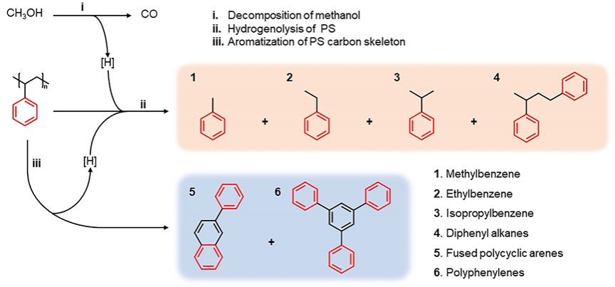图1. 聚苯乙烯氢解、聚苯乙烯热解以及甲醇辅助聚苯乙烯解聚的反应概况与产物解析