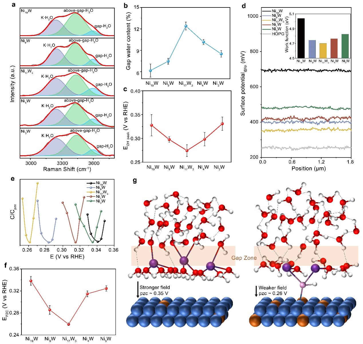 通过原位拉曼光谱对界面水结构的探究发现,与其他镍-钨合金相比,Ni17W3的“gap-H2O”分子比例最高,表明其氢键网络的连通性最好。此外,系列电化学表征表明,Ni17W3具有最强的羟基结合能和最小的表面功函数与零电荷电势(PZC)。较小的PZC有利于界面水结构的重组,而吸附的羟基则易于溶剂中钾离子配位,打破其溶剂鞘,释放自由水,有利于构建更联通的氢键网络结构。