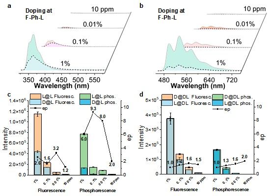 团队首先确认了模块化设计CPE体系的可行性。实验结果表明,在不同掺杂比例下,荧光的增强倍数较低,从1.6到3.2不等。然而,在相同的条件下,RTP光谱的增强倍数显著提高。这种差异是由于客体荧光可以通过Förster和Dexter两种类型的能量转移发生,而客体RTP仅局限于Dexter能量转移。此外,激发-发射二维谱的结果也进一步证实Förster能量转移过程对手性不敏感。根据这些实验结果可以推断,较短距离的Dexter能量传递是导致手性体系磷光增强的原因。