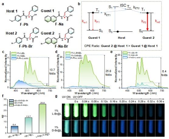 张国庆教授团队在2023年首次发现并命名了CPE现象,揭示了分子间能量转移存在手性依赖特征。(Nat. Commun.14, 1514 (2023).)。在这次的工作中,团队提出了一种更通用的传感方案(图1a),允许RTP的快速手性识别:氨基酸与高活性的2-萘甲酰氯可以在常温常压的温和条件下完全转化为手性能量受体,并在三线态能量给体介质中敏化生成RTP。L-苯丙氨酸衍生物作为通用的三线态能量给体,具有可以大批量生产,纯化方法容易的优点。
