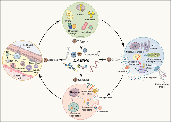 在静息状态下,内源分子作为机体的组成部分,处于免疫豁免状态,并不诱导炎症反应。但是,在细胞遭受损伤或应激时,一些内源分子发生位置、浓度或理化性质的改变,转变成可被免疫系统感应DAMPs。位置改变使得一些内源分子失去细胞/细胞器膜的保护或免疫耐受的环境,从而使其具有促炎作用。例如,ATP、内源性核酸等内源性分子从胞内转移至胞外,可被一些免疫受体识别并促进炎症反应。细胞器内的一些内源性分子在遭受应激时会被释放到细胞质,从而激活胞内的免疫受体。此外,一些内源分子的跨器官运输可以使其从耐受组织或器官进入不耐受的组织或器官,进而诱导炎症反应。内源分子的性质改变包括物理性质和化学性质的改变。在高浓度、低流速的情况下,体液中的某些分子,比如尿酸、胆固醇等,易析出结晶并通过激活NLRP3炎症小体促进炎症反应。另外,内源分子的降解、错误折叠、修饰可导致其化学性质的变化从而获得促进固有免疫应答和炎症反应的能力。有些内源分子的促炎活性与其浓度相关,例如蛋白聚糖、脂肪酸等,在低浓度下不会诱导炎症反应,而高浓度时则被机体视为危险信号。
