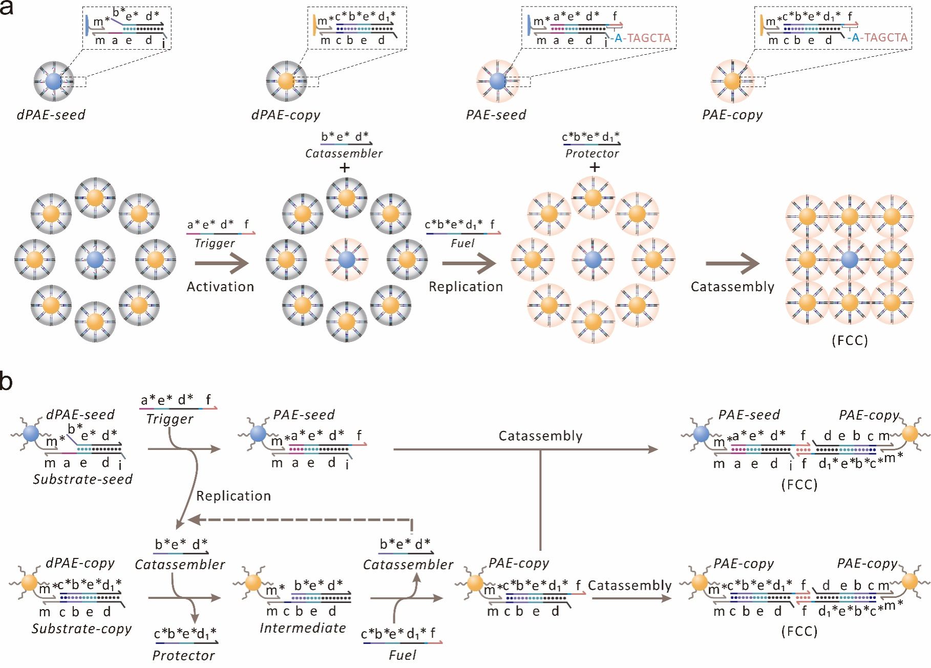 信息的自我复制是自然界的一个关键特征。自复制系统的发展对生命起源的研究具有重要意义。受生物系统中DNA天然复制过程的启发,目前已经报道了一些可以实现自我复制的人工DNA纳米结构。然而,如何利用自复制DNA纳米结构进一步构建可生产大规模三维有序纳米材料的复杂合成系统是一个挑战性难题。