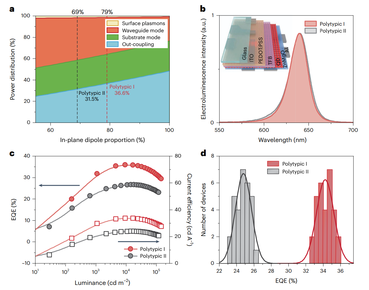 研究人员使用背焦面成像等手段确认了此量子点材料的跃迁偶极矩取向,具有79 %的面内偶极矩占比。使用该量子点制备的量子点LED表现出超高的效率和稳定性(外量子效率35.6%,1000cdm-2亮度下T95寿命:40,900小时)。